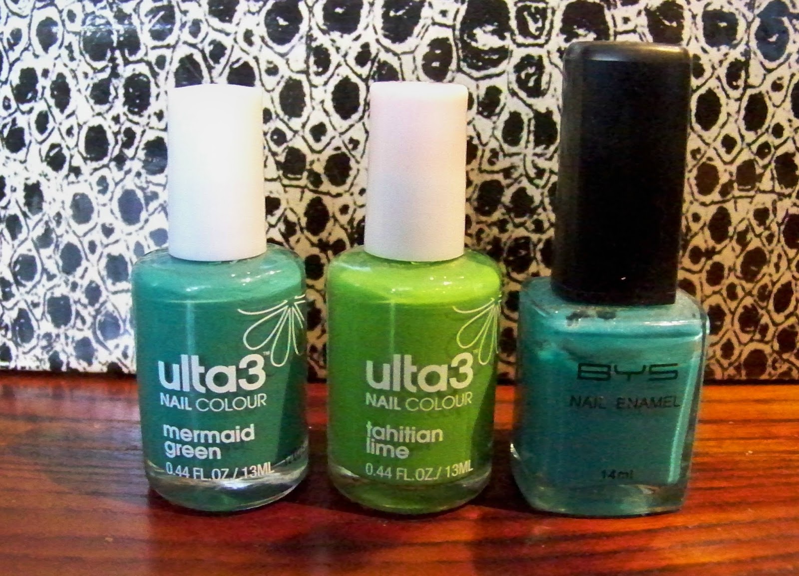 I couldn't be stuffed with a top coat this time. I'm on Day 2 of this mani and the polish is starting to chip a tiny bit at the tips, so maybe I should have. Note that these are all very inexpensive brands of polish, so this is quite the Budget Mani. In retrospect, Mermaid Green and Hocus Pocus are very similar in colour, and I probably should have chosen more distinct shades. But on the whole, I think it looks OK!